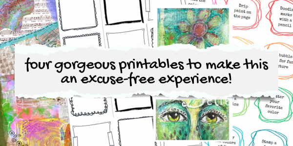 There are 3 recorded lessons below, each with its own set of printables to make this an excuse-free experience! Each lesson is based on a simple tip that I use to find my way back to my studio and the freedom and play I find when I can be creative.